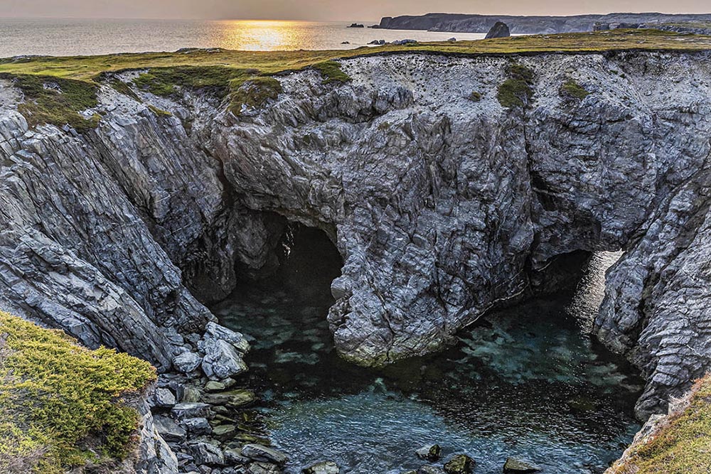Maar het kan nog mooier. Het Dungeon Provincial Park in Bonavista is niet alleen een geologisch pareltje, maar heeft ook een aantal spectaculaire, door de zee uitgesleten zeegrotten. De meest beroemde, de ‘Dungeon’ of kerker, bestaat uit twee uitgesleten tunnels in de rotsen, waardoor zeewater in de 100 meter brede en ruim 15 meter diepe ‘kerker’ stroomt.