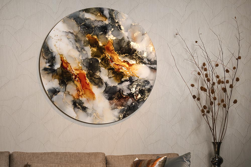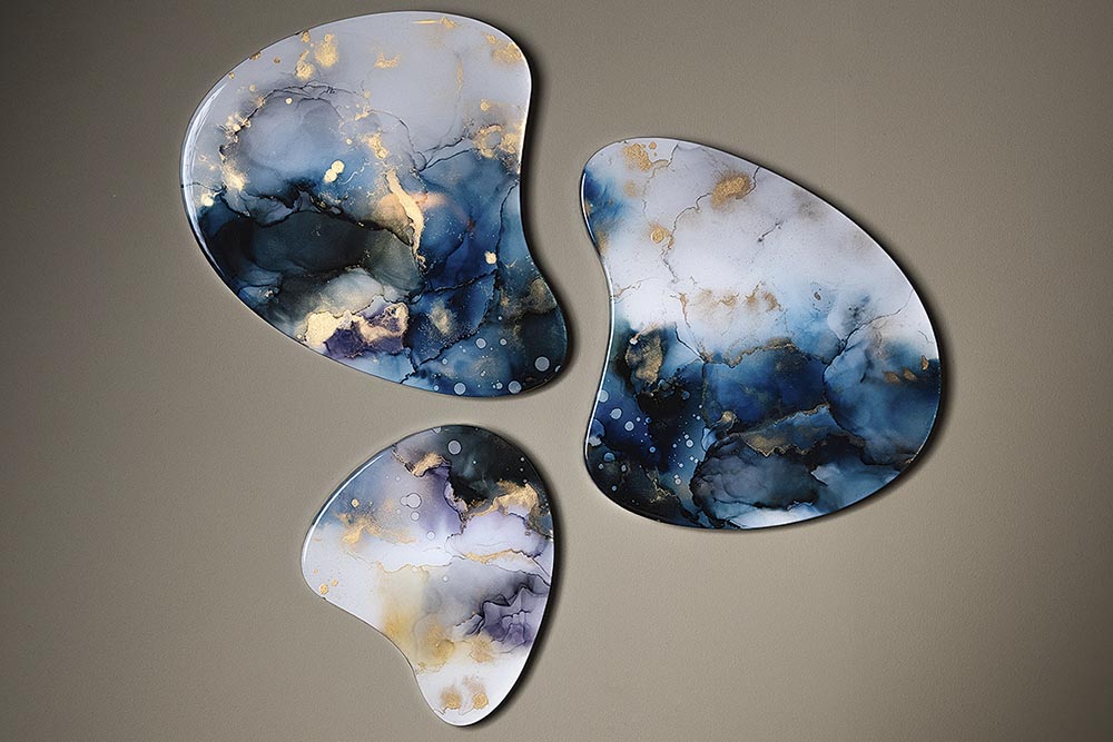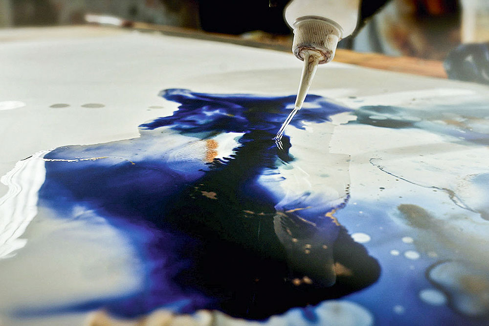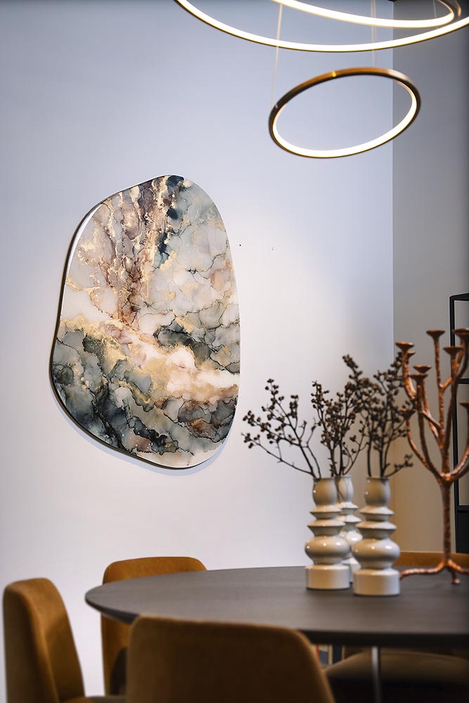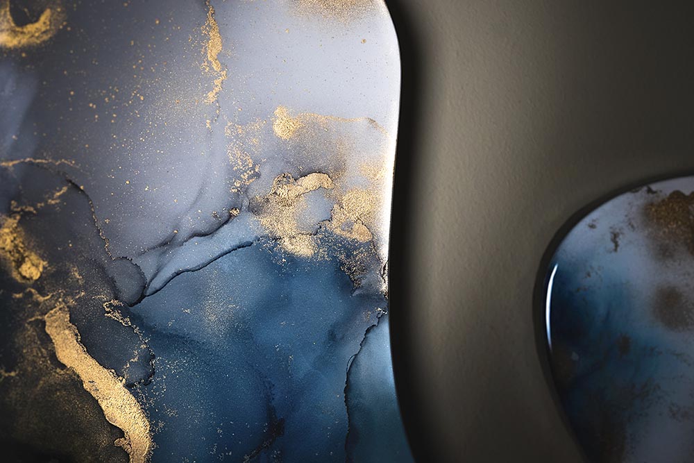 In haar atelier in het idyllische Rijpwetering werkt kunstenares Stephanie van der Beek aan schilderijen waarin de schittering van licht en kleur tot leven komt. Zonder penseel, maar met pure precisie en gevoel, creëert ze composities die voortdurend meebewegen met de kijker. De organische patronen, gelaagde diepte en hoogglans geven haar werk een bijzondere elegantie. Elk schilderij bezit een tijdloze kwaliteit die maakt dat je blijft kijken. “Elke keer vloeit het anders,” zegt Stephanie. “En juist dat maakt de werken uniek. Ik kan ze niet reproduceren, zelfs niet als ik het zou willen.”