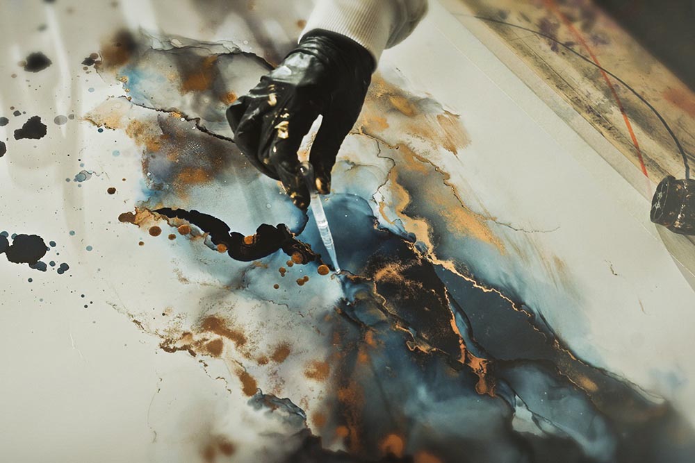 Stephanies techniek is volledig eigen. “Ik heb alles geprobeerd – aquarel, olieverf, acryl – maar ik wilde iets wat niet bestond. Iets dat vloeibaar is, dat beweegt.” Tijdens een zomer van experimenteren ontdekte ze haar eigen manier van werken: een spel tussen controle en overgave, waarin uiteenlopende media en technieken samenkomen om licht, diepte en beweging te vangen. “Het is prachtig, maar ook kwetsbaar. Je moet precies op het juiste moment ingrijpen.
