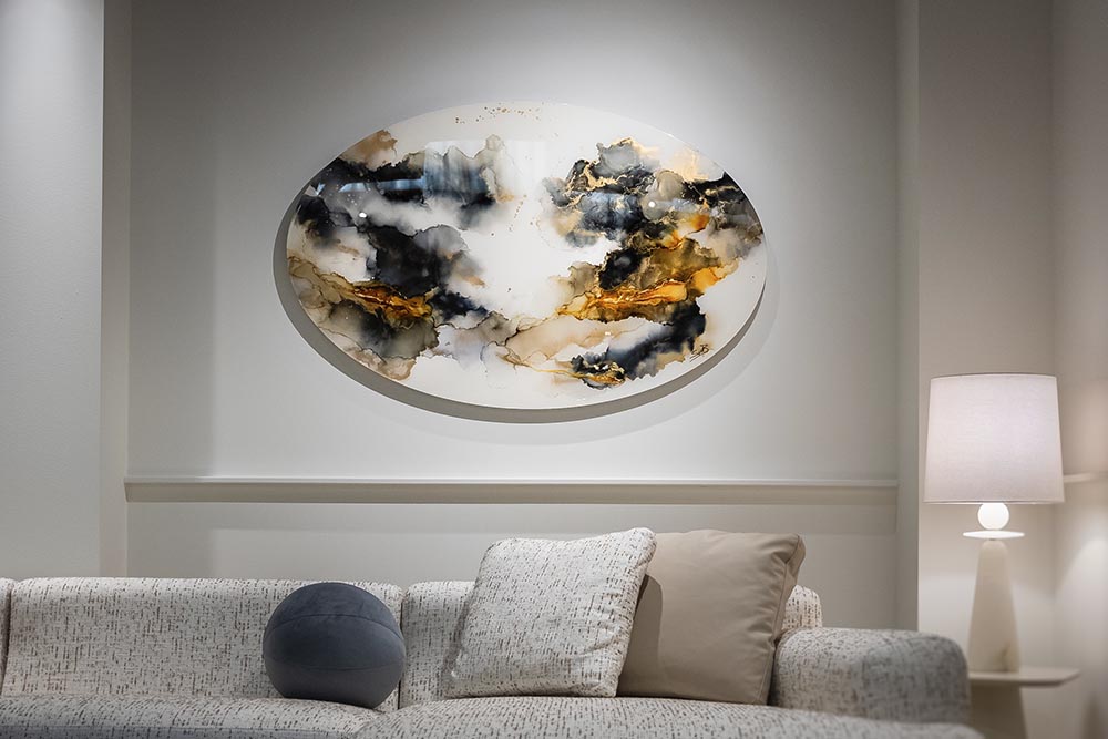 Stephanies herkenbare stijl bestaande uit krachtige organische vormen, glanzende lagen en subtiel goud groeide stap voor stap. “Je ontwikkelt gaandeweg je signature style,” legt ze uit. “Waar sta ik voor? Wat wil ik uitdragen? Voor mij draait een kunstwerk om een gevoel van kracht, energie en om positiviteit die voelbaar is.” Een van de meest kenmerkende elementen in haar werk is het gebruik van goudinkt. “Dat goud heeft een subtiele glans. Het is soms zichtbaar, soms bijna onzichtbaar, afhankelijk van het licht. Maar ook de positie ten opzichte van een werk speelt mee. Beweeg je door de ruimte dan zie je hoe het goud opduikt en weer verdwijnt. “Ik vind dat fascinerend. Als het te dominant zou zijn, zou het zijn kracht verliezen. ’s Ochtends ziet een schilderij er anders uit dan ’s avonds. Dat vind ik magisch. Juist dat spel van verschijnen en verdwijnen zorgt voor verwondering. Het maakt dat je blijft kijken.”