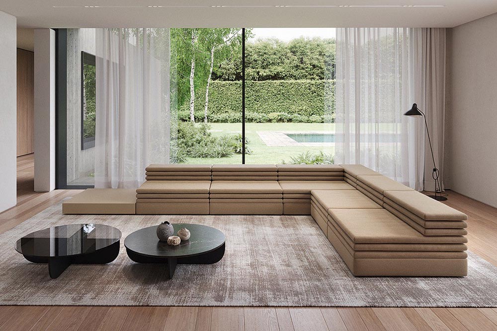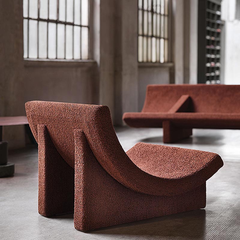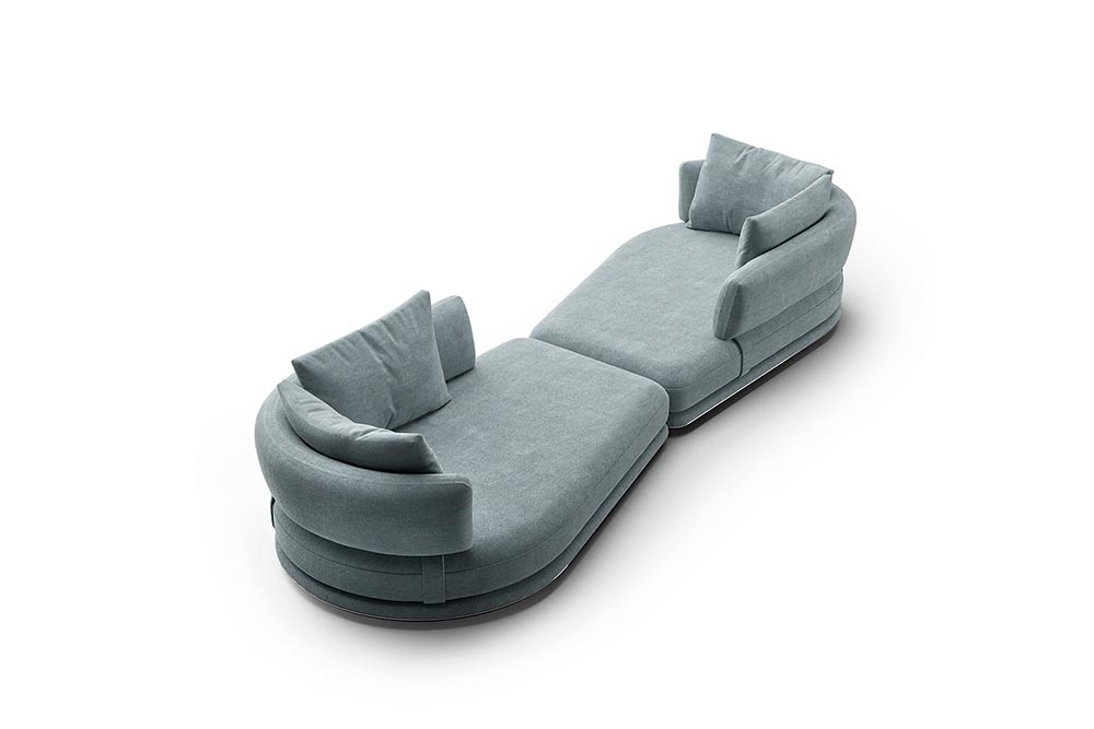 Een nieuwe trend zijn de U-vormige zitmeubelen, zoals deze Trench collectie van Acerbis. De sculpturale, vloeiende vorm biedt een verrassend goed zitcomfort. De volledig gestoffeerde fauteuils en bank ogen licht, alsof ze in de ruimte hangen, ondersteund door slechts twee poten. Mooi detail is hoe bij de bank de poten door lijken te lopen in de armleuningen.