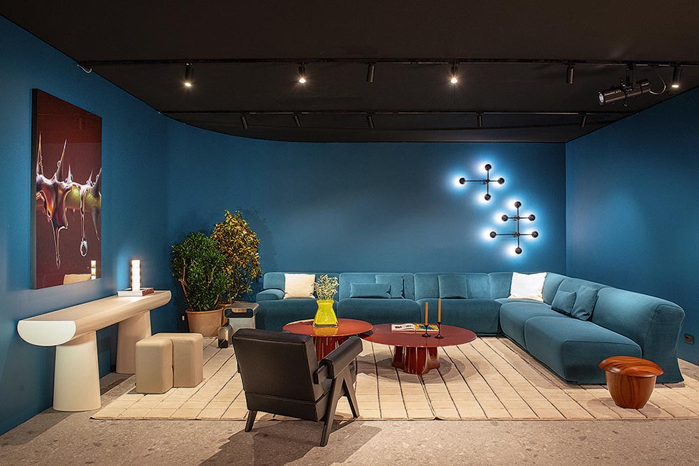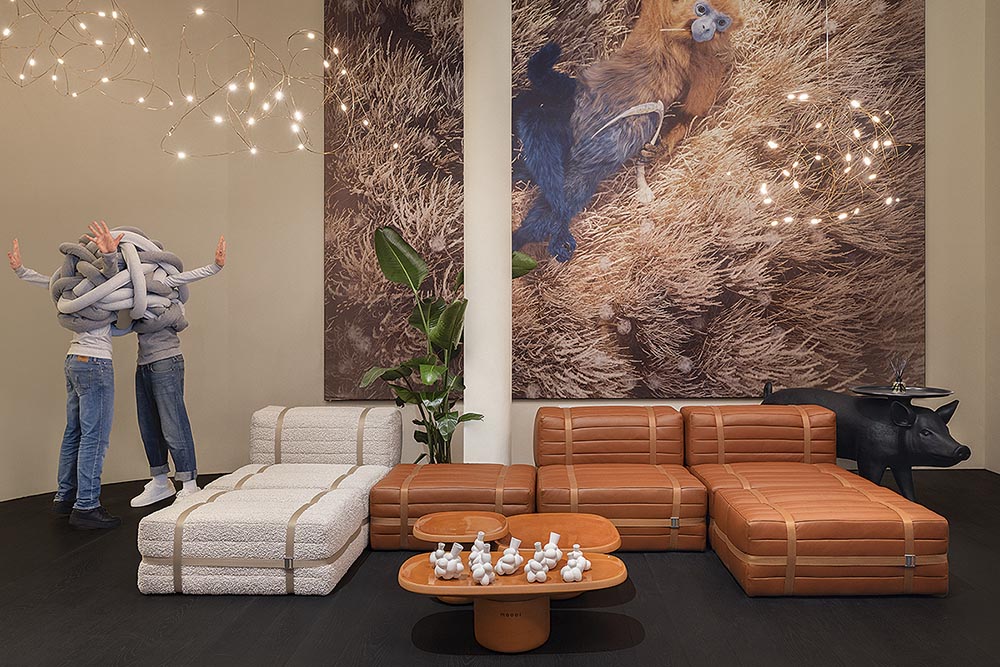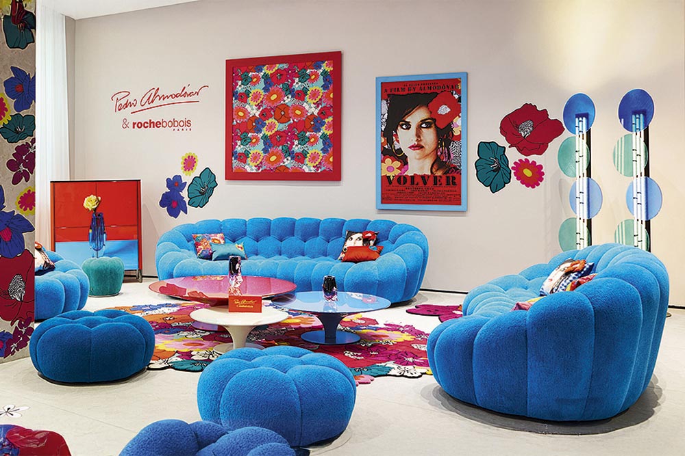 Veruit de meest kleurrijke presentatie zagen we bij Roche Bobois. De bekende Spaanse filmregisseur Pedro Almadovar ontwierp zijn eerste meubelcollectie; net als zijn films meesterlijk van kleur en visuele enscenering. Tussen alle bonte kleuren door, herkennen we natuurlijk de ogen en rode lippen van Penelope Cruz, in o.a. Volver en de stiletto-hak-met-geweer uit High Heels.