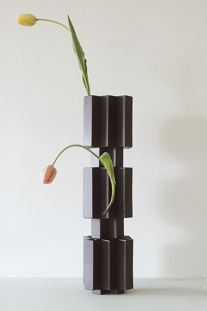 Concept: door een minimalistische benadering en een sterke focus op geometrische vormen, ontwikkelde Esther een duidelijke en herkenbare signatuur. Ze onderzoekt steeds de vraag: hoe níet functioneel moet een vaas zijn, om als kunstwerk te kunnen bestaan? Zo beweegt haar werk zich tussen stilte en vorm, massa en leegte, tussen bruikbaarheid en betekenis. Haar vazen zijn altijd zwart, zodat alle aandacht uitgaat naar de vorm. Deze (tulpen)vaas bestaat uit drie stapelbare delen, die allemaal ruimte bieden aan losse bloemen of takken.