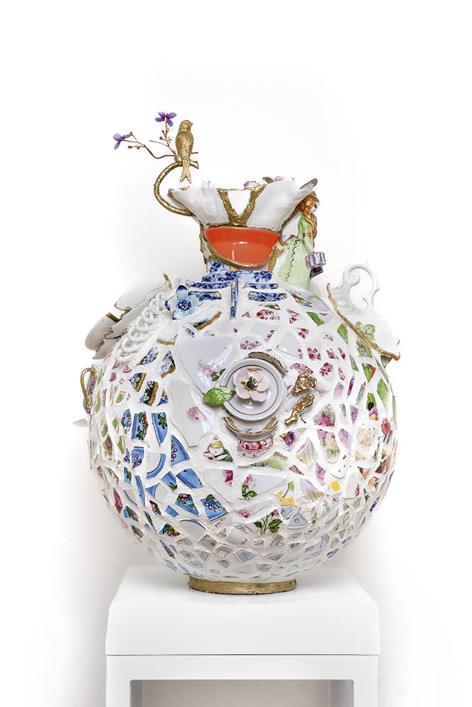 Concept: handgemaakte ‘mozaïekvaas’, waarbij een bestaande vaas belegd wordt met stukjes brocante porselein; soms enkel als decoratief detail, soms als vertellend figuur. De porseleinen stukjes worden met de hand en een diamantslijpschijf uitgesneden, geplakt, daarna wordt de vaas gevoegd en de voeg gelakt.