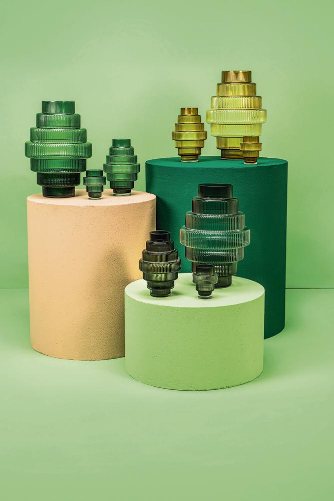 Concept: trapvormige vazen in drie maten en vier kleuren: groen, amber, grijs en paars. De geribbelde details en het subtiele kleurverloop geven de Steps hun unieke uitstraling. Voor een enkele sierlijke tak, of weelderige bos bloemen. Met bijpassende kaars- en waxinelichthouder.